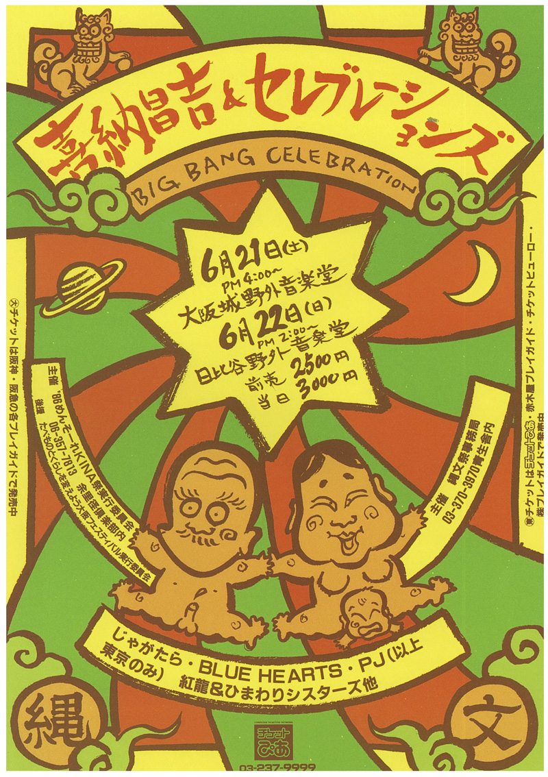 1986年のこの日比谷野音のコンサートで上々颱風と改名しますと発表。これが「紅龍&ひまわりシスターズ」名の最後のステージ。チラシにはじゃがたら、ブルーハーツの名があります。