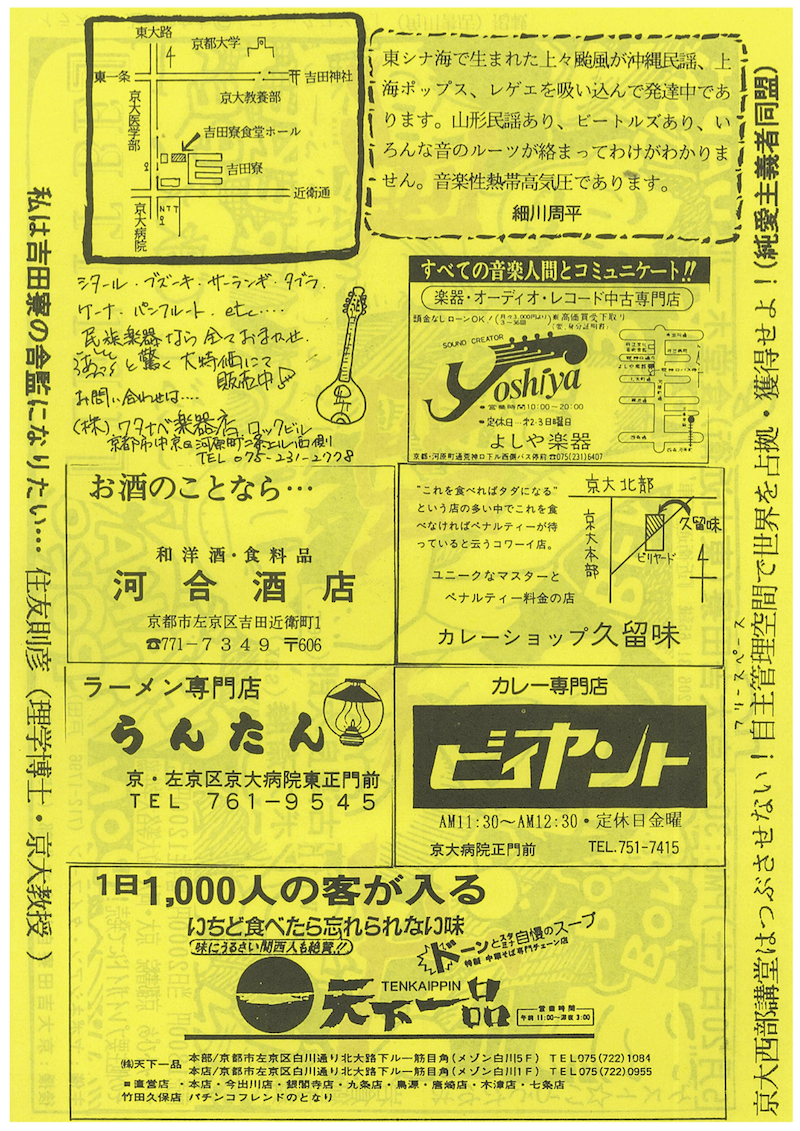 こちらはその時のチラシの裏ですが広告が時代を写していて面白い。まだラーメン店「天下一品」は直営店が9店舗のようです。ツァーで京都に行った時は必ず食べに行ってました。
